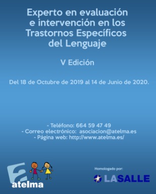 Por cuarto año consecutivo, ATELMA organiza el "Experto en Evaluación e Intervención de los Trastornos Específicos del Lenguaje" homologado por la Universidad de La Salle. Este año se lleva a cabo la V Edición del mismo y tenemos el orgullo de participar en él llevando a cabo el módulo relativo a "Materiales, herramientas y recursos adaptados a niños y niñas con Trastornos Específicos del Lenguaje". Estamos encantados de aportar nuestro granito de arena a la formación de esta dificultad que, poco a poco, va siendo menos invisible. ¡Muchas gracias por confiar en nosotras otra edición más!