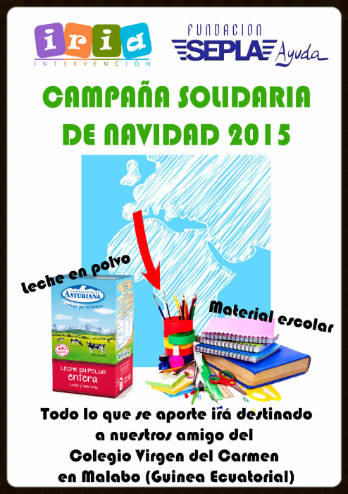 Durante este mes de Diciembre, dentro de las diferentes acciones solidarias que se realizan desde el Centro, se va a llevar a cabo la tradicional Campaña de Navidad a favor de nuestros amigos y amigas del Colegio Virgen del Carmen en Malabo (Guinea Ecuatorial). En esta ocasión, la campaña estará destinada a la recogida de leche en polvo y material para manualidades (por ejemplo: cartulinas, papel de seda, papel de charol, folios de colores, pegamentos, gomets, celo, lápices, gomas de borrar...).